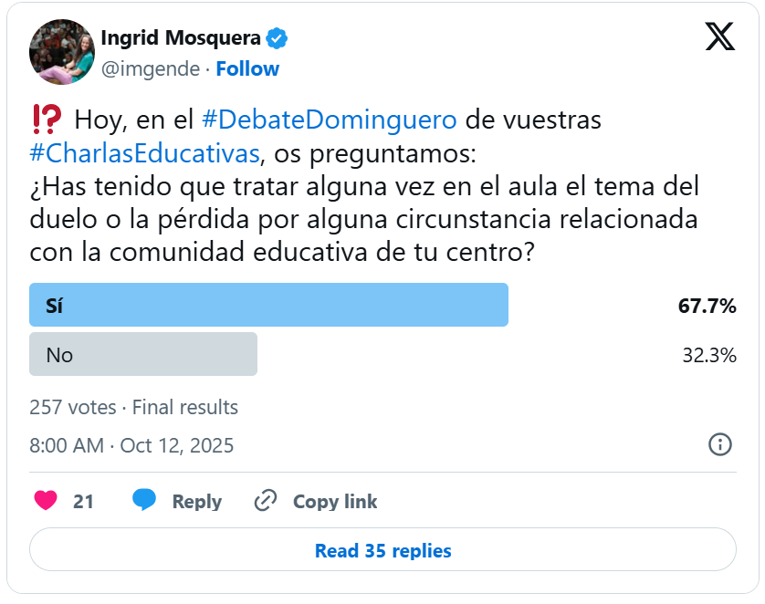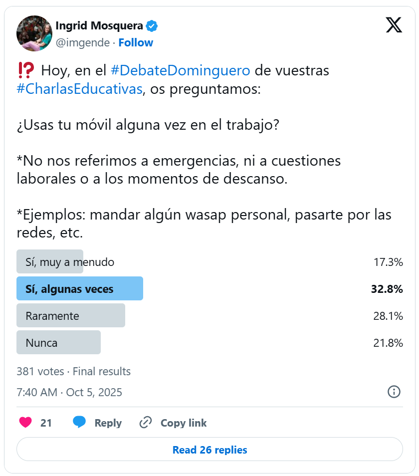 ⁉️ Hoy, en el #DebateDominguero de vuestras #CharlasEducativas, os preguntamos:En general, ¿tu trabajo te estresa?— Ingrid Mosquera (@imgende) October 19, 2025