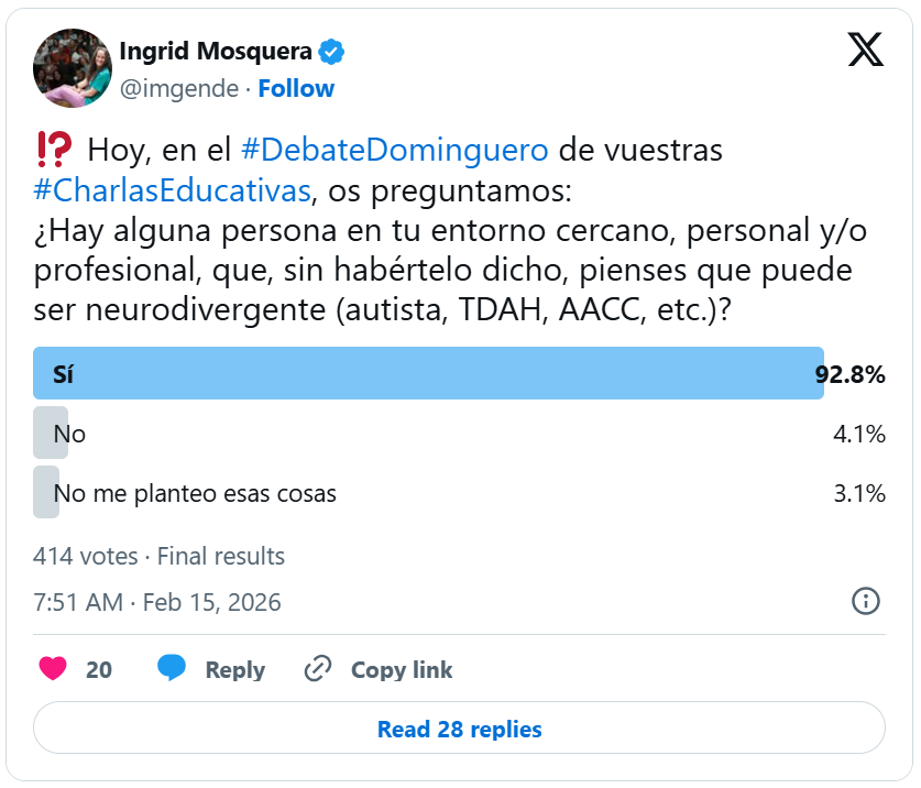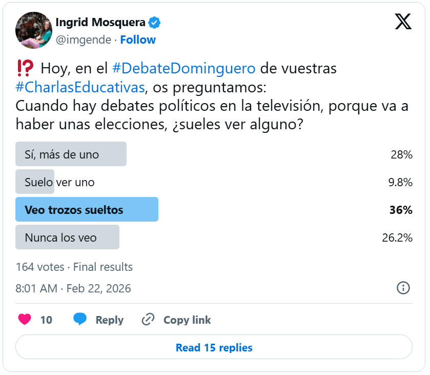 ⁉️ Hoy, en el #DebateDominguero de vuestras #CharlasEducativas, os preguntamos:¿Te preocupa más el mal uso de la IA que pueda hacer el profesorado o el alumnado?— Ingrid Mosquera (@imgende) January 25, 2026